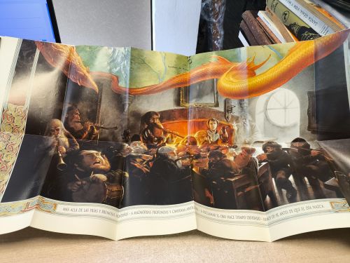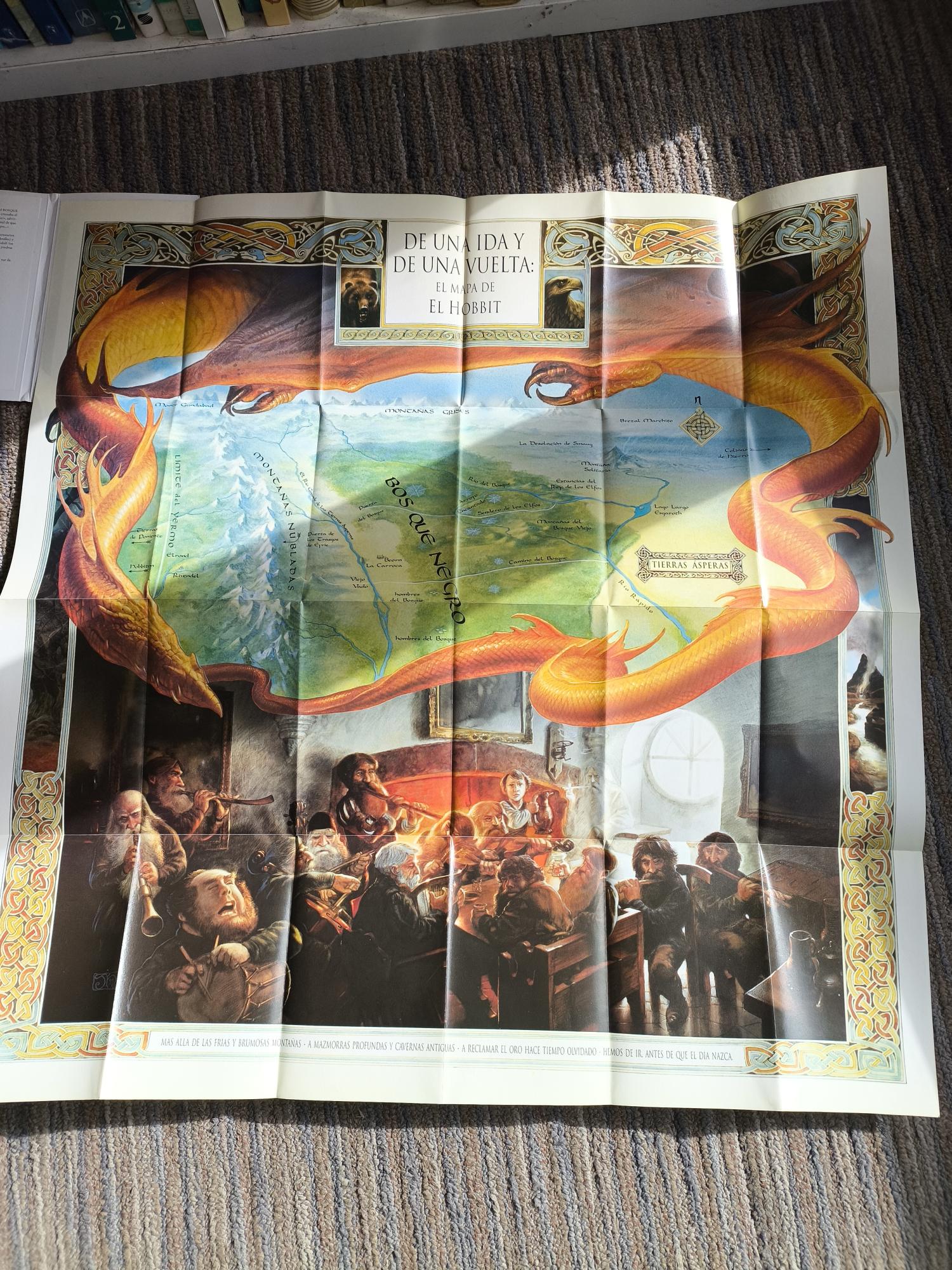Por primera vez se puede seguir la gran aventura del hobbit Bilbo a través de un magnífico mapa ilustrado y coloreado. El Bosque Negro, El Arrollo Encantando, La Desolación de Smaug, Rivendel, y El Yermo son algunos de los lugares que Bilbo visita en su extraordinario viaje.